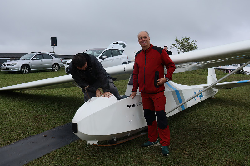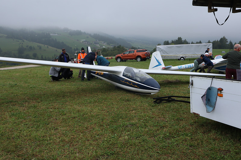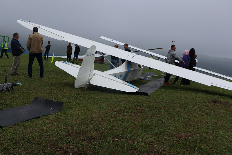 W niedzielę 7-go b.m. o godz. 10.00 było lepiej o tyle, że nie padało. Było zimno, szaro, ponuro z bledziutką nadzieją meteo na lepiej. Niemniej zaczęto rozpakowywać przywleczone statki powietrzne – aż dwa Grunau Baby, dwie Muchy Standard i już pojedynczo kolejne – SZD-15 „Sroka” (!) SZD-25 „Lis”, SZD-24 „Foka”, SZD-30 „Pirat”, SZD-36 „Cobra”, Schleicher Ka-8 i dodatkowo szkolna kompozytowa PW-2 „Gapa” z pocz. lat 90-tych.