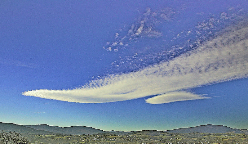 Wilgotny wiatr z południa napotyka leżące w poprzek Karpaty, w tym najwyższe Tatry. Pędzące powietrze unosi się nad przeszkodę, ochładzając się w miarę wysokości i osuszając (na grani tworzą się chmury) a powietrze opada po stronie północnej (zawietrznej) gór gwałtownie się ocieplając i nabierając szybkości. A owa fala ? Weźmy przykład z górskiego potoku, gdy w dnie tkwi głaz, szybko płynąca woda tworzy falę tuż za przeszkodą, potem drugą, trzecią itd. coraz mniejsze. Przelewające się przez Tatry powietrze też tworzy fale, nad których grzbietami bardzo wysoko tworzą się chrakterystyczne obłoki soczewkowe (altocumulus lenticularis) nieruchome chmury w kształcie soczewki wklęsłej. Soczewka wskazuje komin bardzo silnego wznoszenia, sięgający czasem wielu tysięcy metrów wysokości.